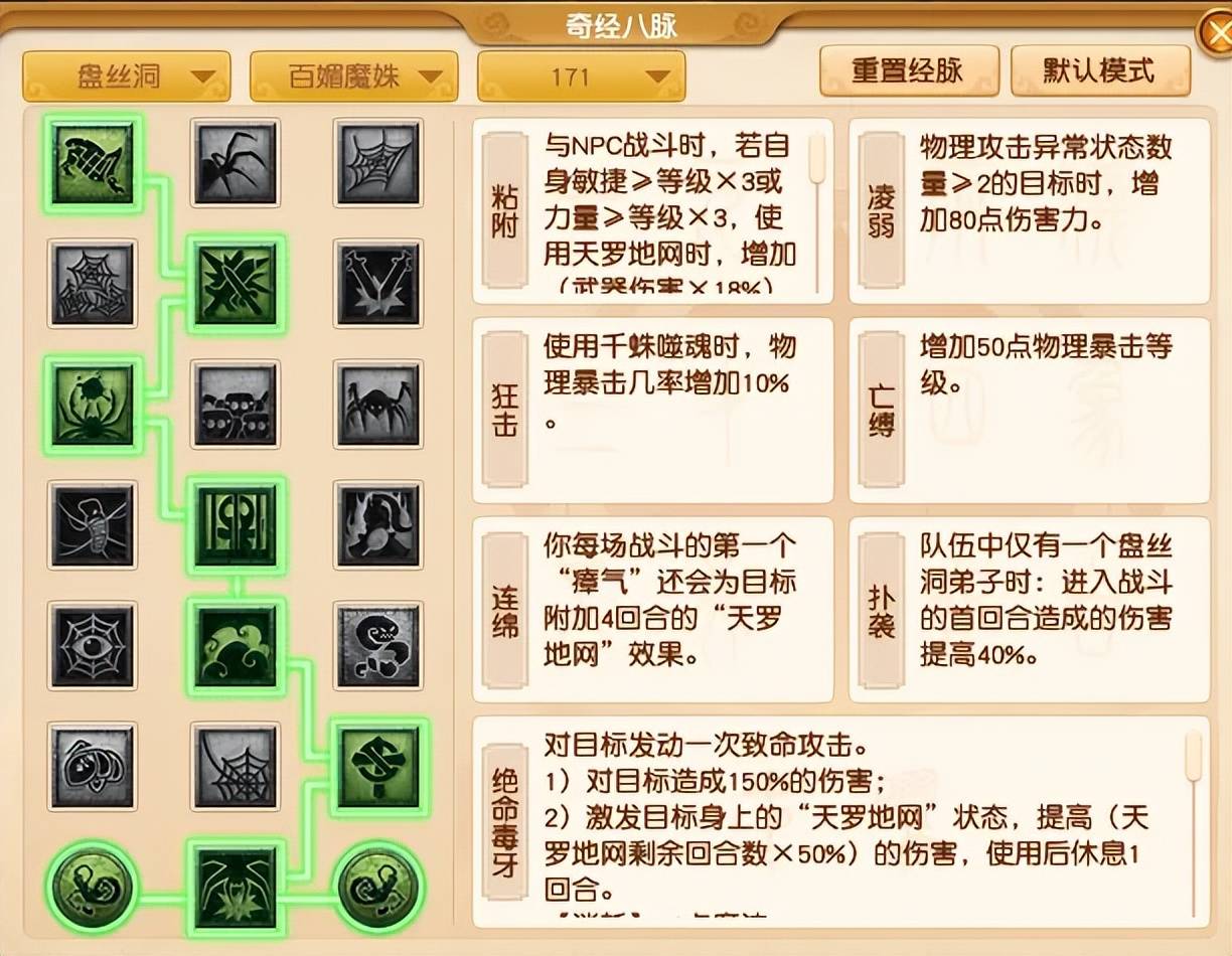 目前盘丝洞的任务玩法主要以“全力固伤”为主。因此,任务流派推荐选用【百媚魔姝】,经脉点法为“1212232”。这套点法不仅可以最大化提升任务输出能力,还可以额外获得一定的暴击几率。可以说,全力盘丝配个破血特技,即便没攻修也能打出不俗的伤害。