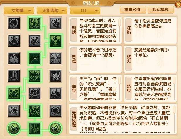 本次门派调整对女魃墓几乎没有影响,所以大家在任务流派上依然可以选择【无相鬼魃】,经脉点法为“2322122”。这样点不仅可以稳定获得一个怨灵,还能通过【怒火】经脉实现秒4,任务输出能力嘎嘎猛!