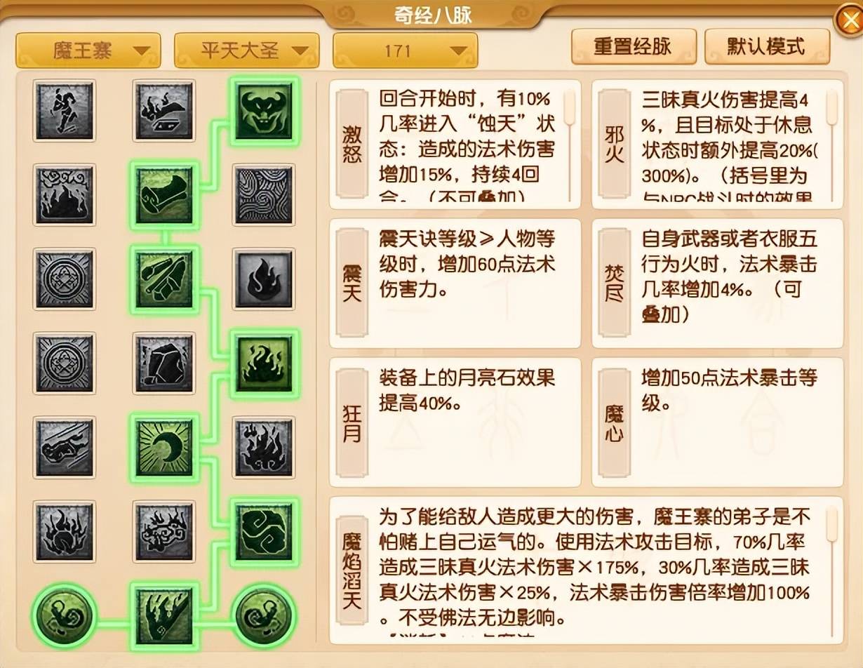 本次门派中,并没有对魔王寨进行太多的调整,所以推荐大家选择【平天大圣】流派刷任务,经脉推荐采用“3223232”的点法。这样虽然放弃了飞砂走石40点伤害结果,但也有10%几率获得“蚀天”BUFF,可以提升15%法术输出,性价比非常高。