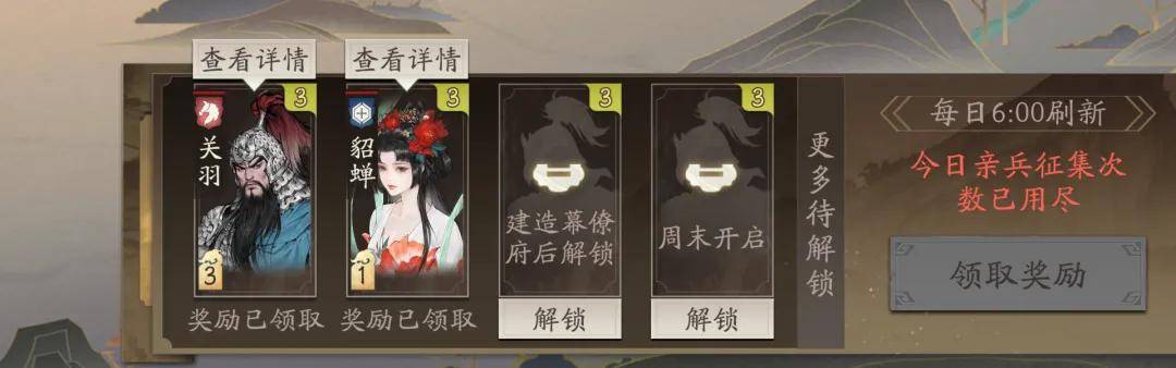 最后稍微补充几句,在一些地图上会隐藏一些宝箱或人物的直线任务等,大家可以随意转转,例如在汜水关大营和主城都有不少,此外三望也有武将碎片的跑片系统,例如第一天维一就选的跑关羽和貂蝉的碎片,大家可以根据自己的情况来选择,三望的武将想要拉到最高星级(游戏里叫升迁,一共有10级)其实还是比较难得,所以维一准备部分角色就不追求满星了,拉到核心的门槛即可,例如貂蝉我就准备慢慢跑到第5阶即可,另外在部分战斗手选武将进行单挑也可以获得碎片,有这方面需求的朋友可以特别注意一下。