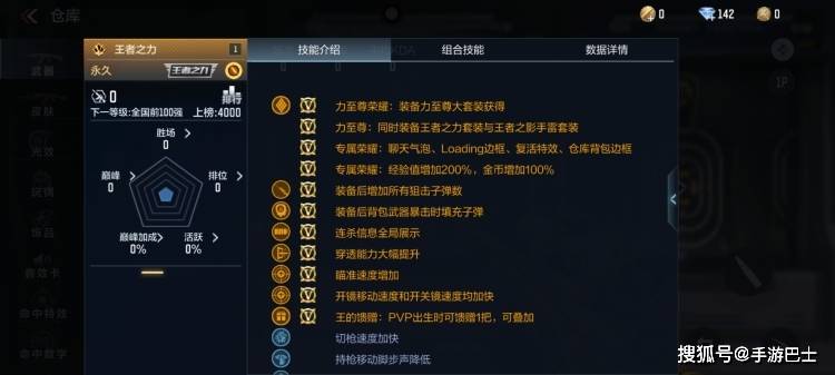力至尊荣耀加持使它更为尊贵,拥有装备后可增加狙击子弹数、暴击时填充子弹、连杀信息全局展示和王者武器专属馈赠的基本属性,在武器技能方面,王者之力的穿透能力得到了大幅提升,在开镜移动速度、瞄准速度、开关镜速度、切枪速度上均有加快,除此之外,它的持枪移动脚步声也得到了一定的降低。