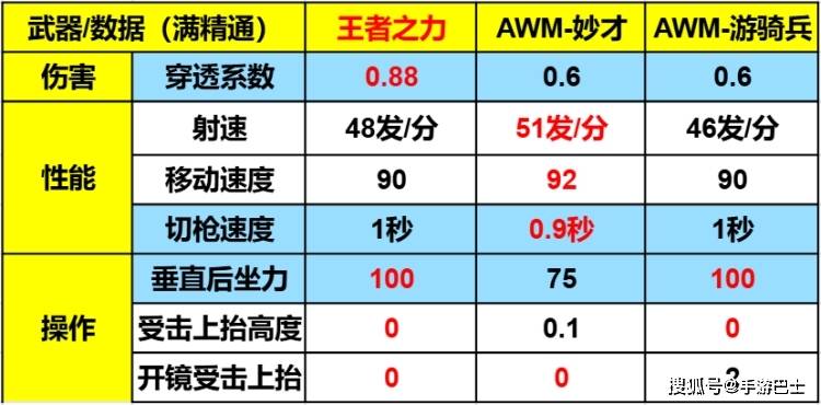 将王者之力与游戏内主流的两把AWM系列武器AWM-妙才和AWM-游骑兵作对比。我们发现,王者之力在穿透系数、垂直后坐力、受击上抬高度和开镜受击上抬数值上都要优于另外两把武器,仅在射速、移动速度和切枪速度方面略有不足,这些数值在对局中可以忽略不计。