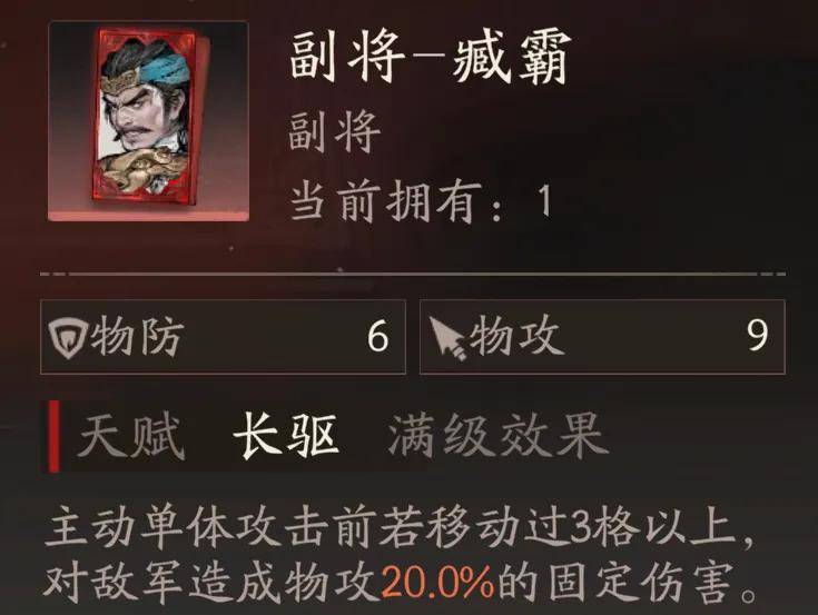 相反追求主动输出的则可以考虑臧霸,这个其实也是吕玲绮的首选副将之一。哦对了,后续等张飞池子开了这个副将也会更新一波,到时候我们就可以选择韩浩+夏侯昭的组合搭配了......(下图为夏侯昭的天赋效果)