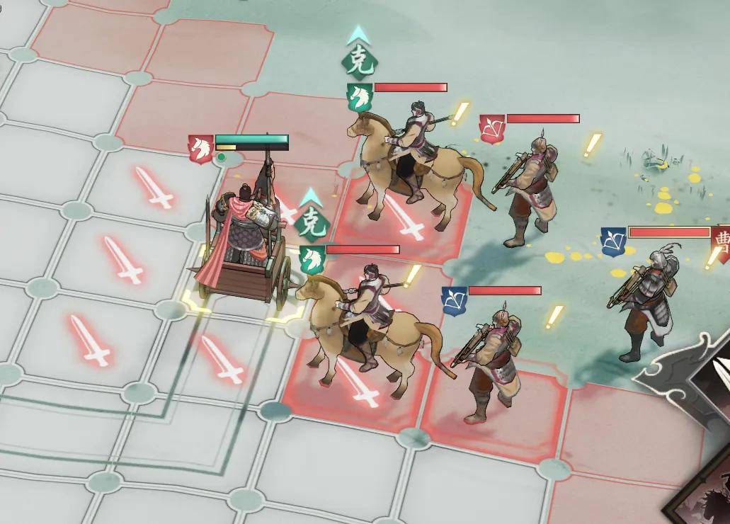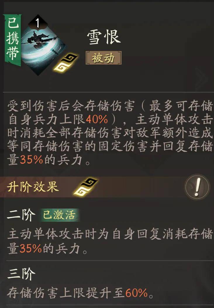 然后第三个技能是需要选择“战车”兵种才能解锁的【雪恨】被动,这个被动可以让夏侯惇在受到伤害时储存伤害,而在下回合主动攻击时就能打出更高的单体伤害,如下图所示我们如果有储存了伤害,则在主动攻击时可以打出两段伤害,且这两段伤害都是可以触发回复效果的,所以【雪恨】这个技能也是蛮符合于夏侯惇特点的一个增伤技能,另外为什么夏侯惇会更推荐走“战车”兵种路线,其还有个核心原因就是这个兵种路线的基础输出范围是九宫格(相当于1圈),而骑兵路线则只有1格,所以毫无疑问战车兵种还能更好的辅助夏侯惇被动反伤的效果。