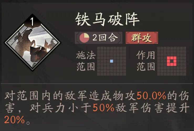 当然夏侯惇在骑兵兵种路线上也有两个技能,其一便是【铁马破阵】,一个范围输出技能,但夏侯惇其实更多的输出还是会来自于被动回合的反伤输出,所以这个群体伤害的意义并不算很大。