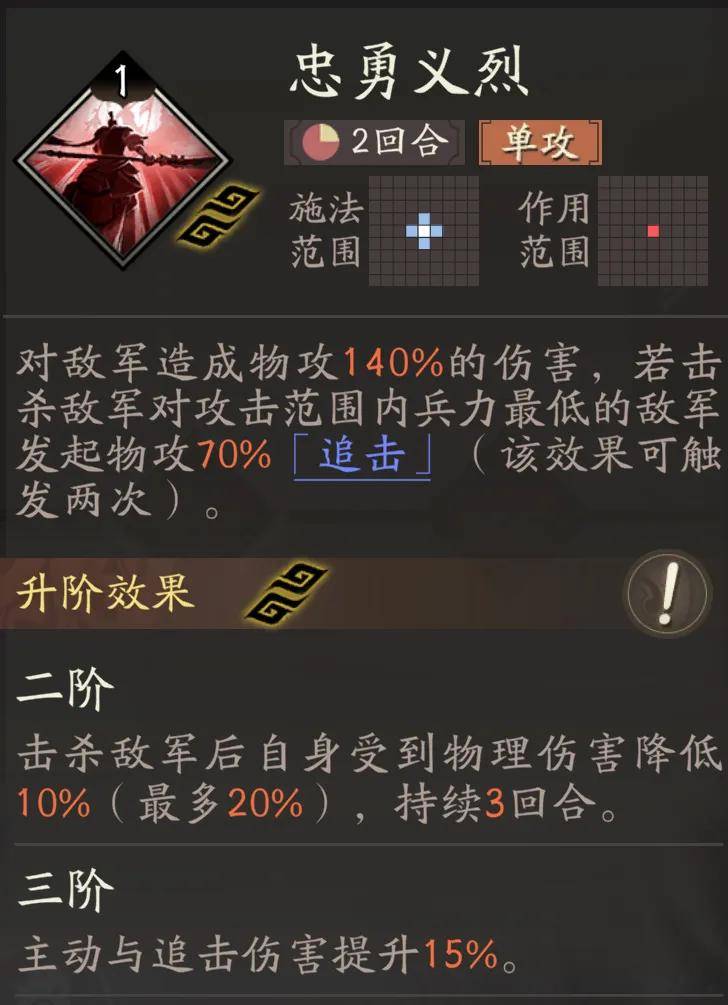 最后则是同为骑兵兵种路线才能解锁的【忠勇义烈】,不俗的单体爆发+定向单体追击的效果,从单体输出的角度这个技能肯定是要超过之前的两个基础单体技能,但由于我们要选骑兵兵种就得消耗“龙骧之印”,所以普通玩家在前中期也不太会去拿这个单体技能,大家后续则可以根据自身的情况来做取舍。