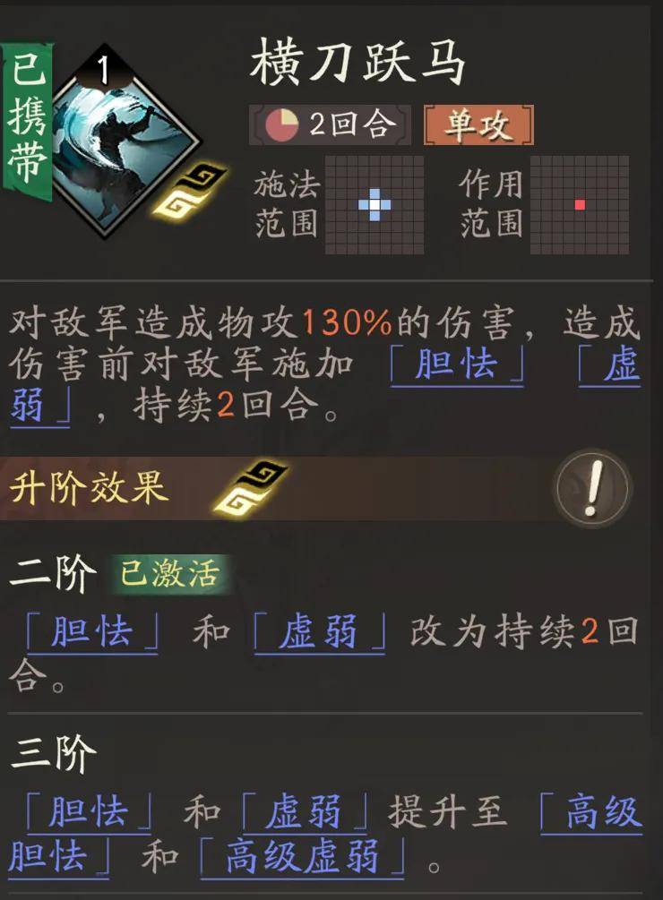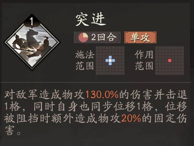 第二个基础技能【突进】也是一个1格内的输出技能,特点是可以击退敌方,达成条件后还有20%物攻的固伤,算是和【横刀跃马】各有优劣,大家可以视情况取舍考量。