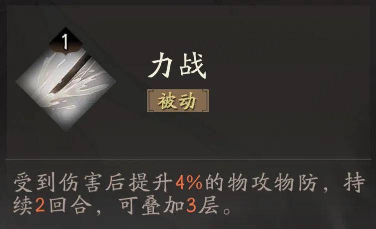 接着第四个技能同样是战车兵种路线的【力战】被动,可以在受到伤害后提升自身的攻防能力,算是一个小小的增益技能。