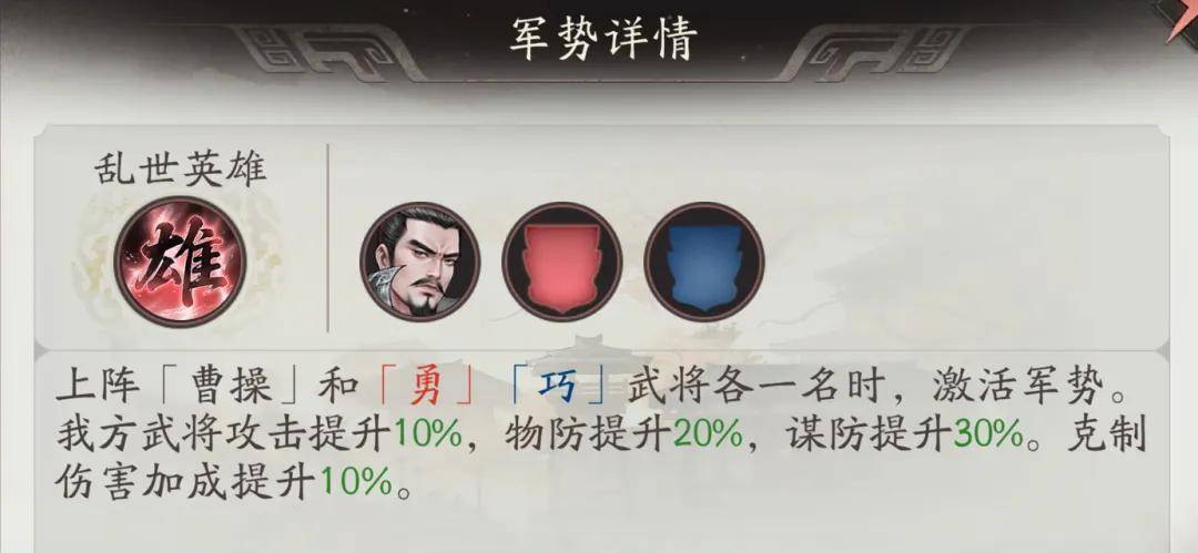 最后在配队上,其实夏侯惇在策划的眼里就是给曹操在初期凑军势用的,曹操+夏侯惇+夏侯渊刚好就能凑出这个军势的要求,所以大部分朋友在开荒期间应该都会用到这个阵容和军势。