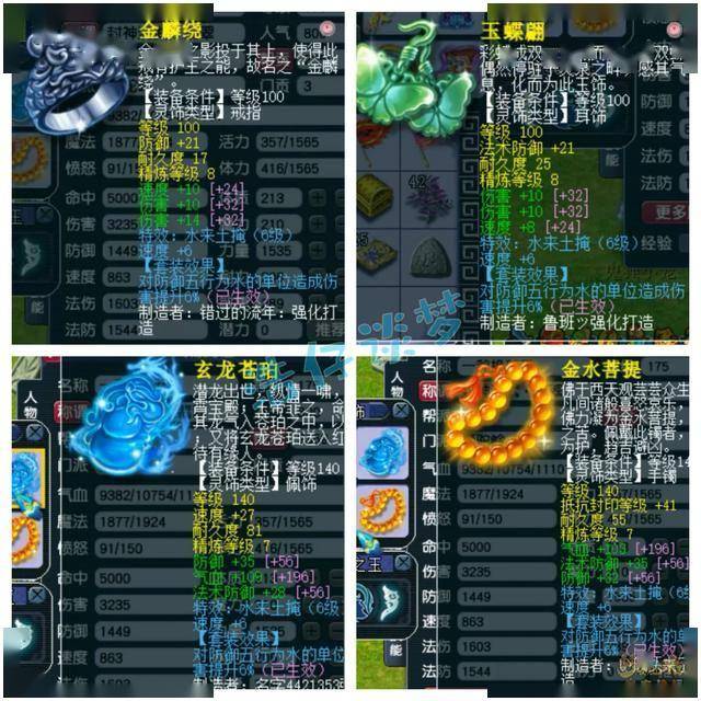 戒指和耳饰下排都是双伤害一速度,配饰和手镯下排都是气血防御法防,特效都是6级水来土掩。