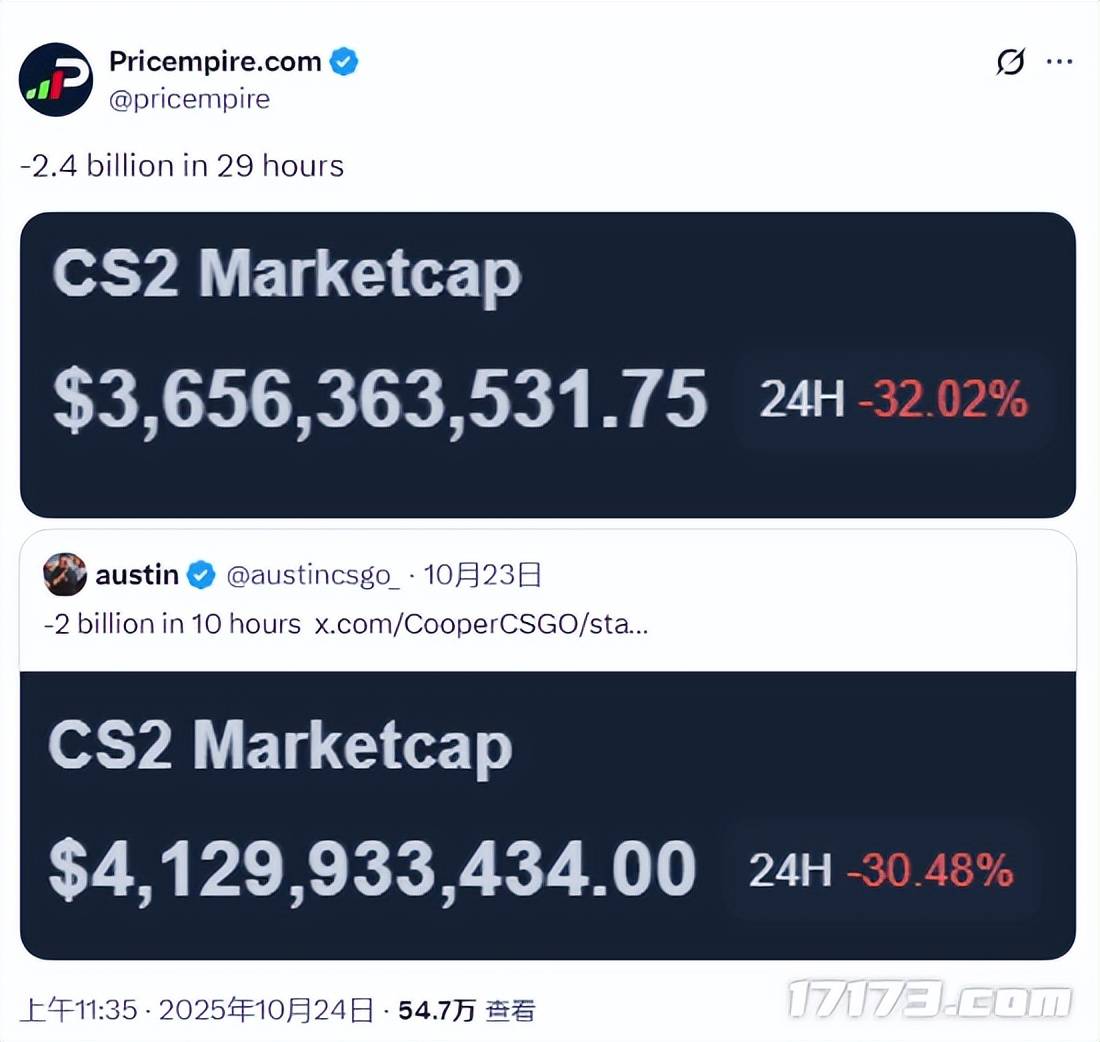根据PriceEmpire的数据显示,在更新上线的29小时内,《CS2》饰品市场的总市值从约60.6亿美元暴跌至36.5亿美元,短短一天多的时间里就蒸发了约24亿美元(约合人民币170.9亿元),跌幅最高时达到39.6%。
