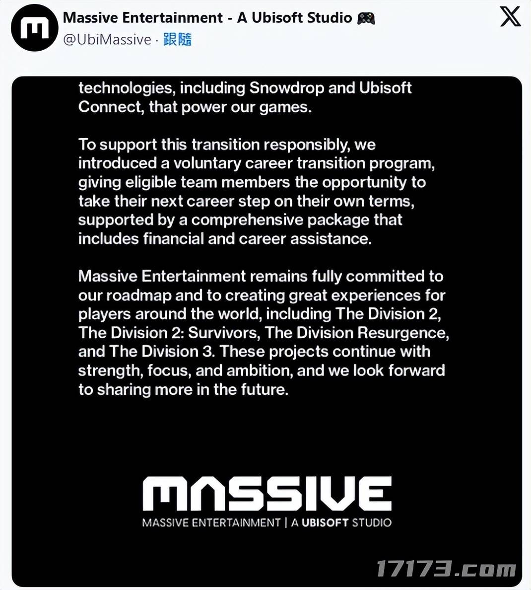 育碧旗下知名工作室Massive Entertainment发布官方公告,宣布为优化长期发展规划与资源布局,将对团队进行重组,并推出一项“自愿职涯转换计划”,以自愿离职的方式裁撤部分员工。