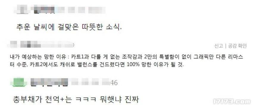 对于Nitro的破产,大部分韩国网友都表示幸灾乐祸,有网友就调侃,这是寒冷的日子里一个暖心的消息。还有网友表示,《跑跑卡丁车:漂移》就是画面升级了,吃相更难看了,其他没太多变化,不凉才怪。还有网友好奇,就做了一款游戏怎么就搞出千亿韩元的负债来的。