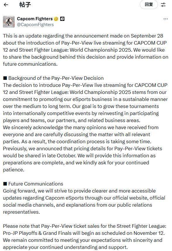 根据卡普空格斗游戏官方X(原Twitter)账号的公告,引入付费直播的决定旨在“以中长期可持续的方式推动卡普空电竞业务发展”,目标是将赛事打造为“具备国际竞争力的活动”。卡普空表示,理解社区内存在不同意见,目前正与相关方就付费方案进行协商,但这一过程“需要一定时间”。