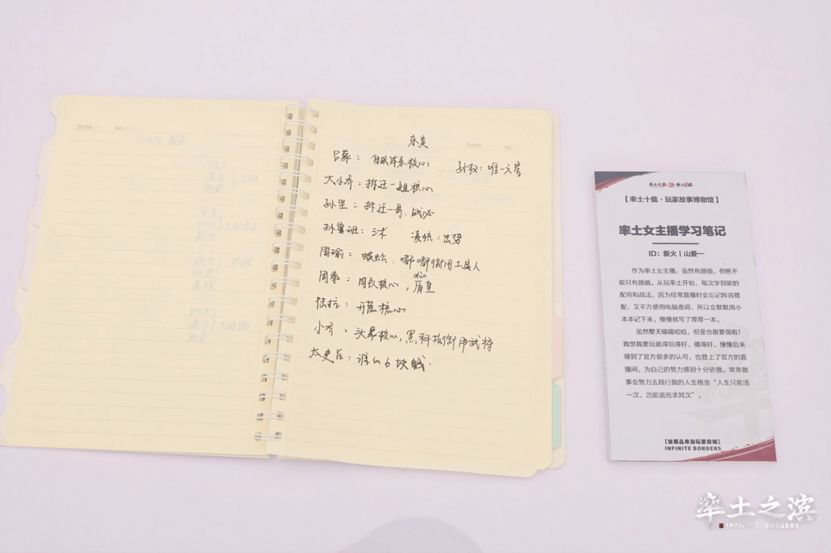 翻开笔记,里面密密麻麻记录着各种武将搭配、战法克制关系和开荒技巧。 从“吕蒙=自成体系核心”到“周泰=肉队核心, 盾皇”,再到不同阵容在不同等级和兵力下应该挑战几级地,每一个细节都经过了精密的计算和实战的检验。这本笔记无声的展示出“山爱一”在“美女主播”这个看似光鲜的标签之下,隐藏着一颗对率土无比热爱与钻研的硬核之心。