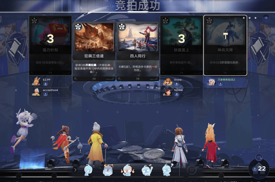 此外,对局中还加入了“竞拍”环节。一些强力的英雄牌和效果牌会进入拍卖场,由所有玩家共同竞拍。这为通常是各自为战的自走棋玩法,增加了一层直接的互动和心理博弈。这个机制很考验玩家对游戏和场上局势的理解。
