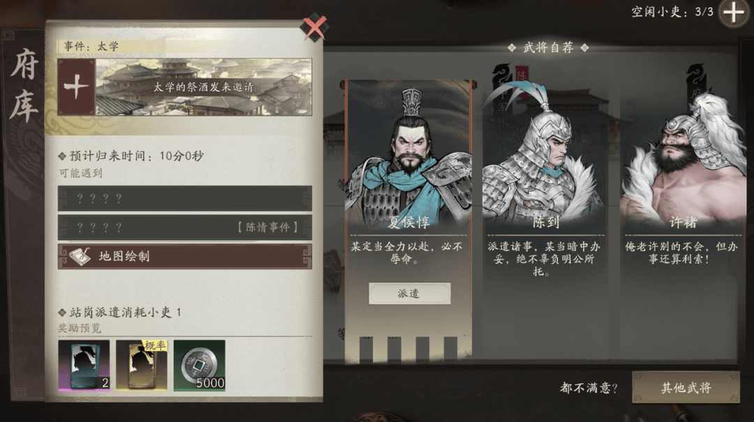 比如说一个寻常的武将派遣收菜玩法,游戏为它单独做了个幕僚府,配上了不少文案,会出现陈情事件,派遣结束后还需要评价武将。但它最终给玩家的体验,未必就比那些一键派遣收菜,除了奖励什么内容都没有的游戏好。