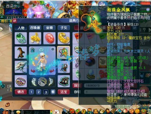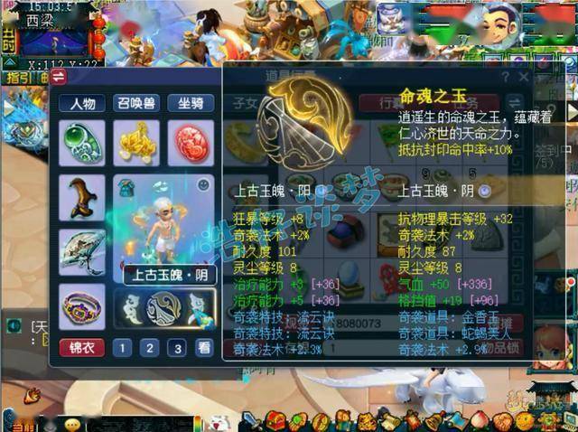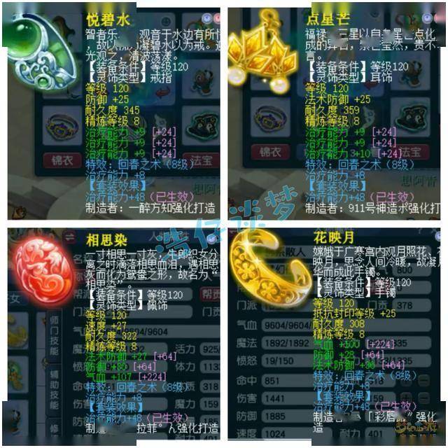 戒指和耳饰下排都是三治疗,配饰和手镯下排都是气血防御法防,全部打了8锻星辉石,特效都是8级回春之术。