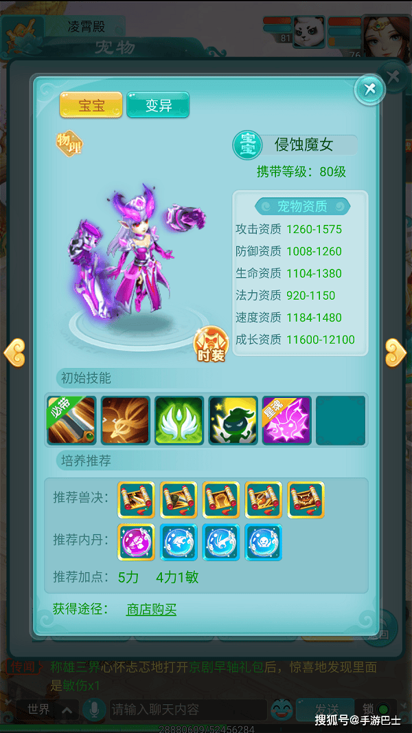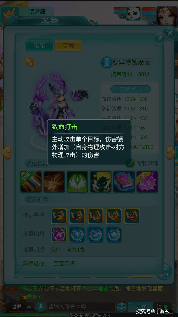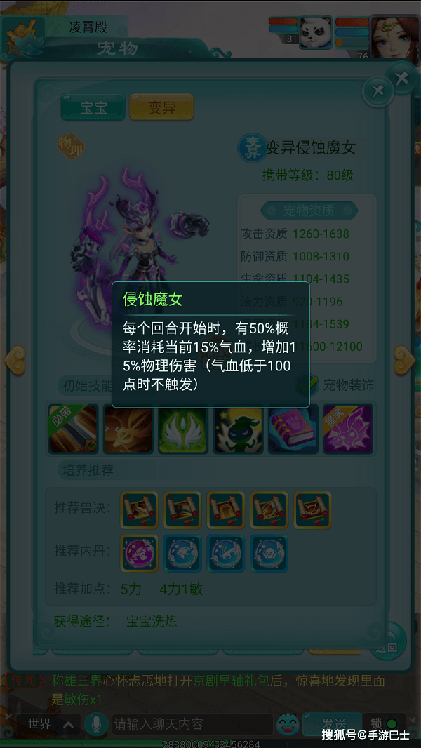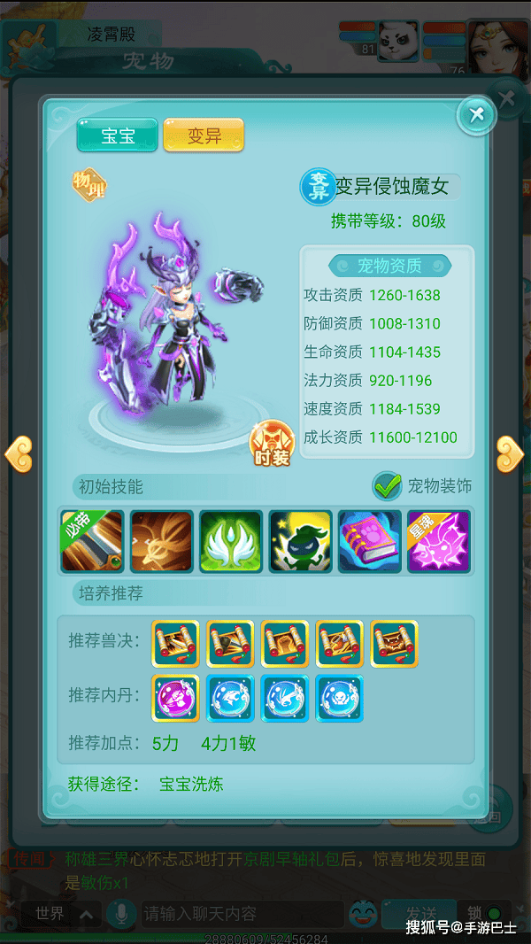 变异后的侵蚀魔女拥有高达1638的攻击资质与1539的速度资质,在80级宠物中表现相当亮眼。不过她的防御和生命资质相对薄弱,属于典型的"玻璃大炮"型宠物,需要在战斗中精心保护,否则很容易被集火击败。