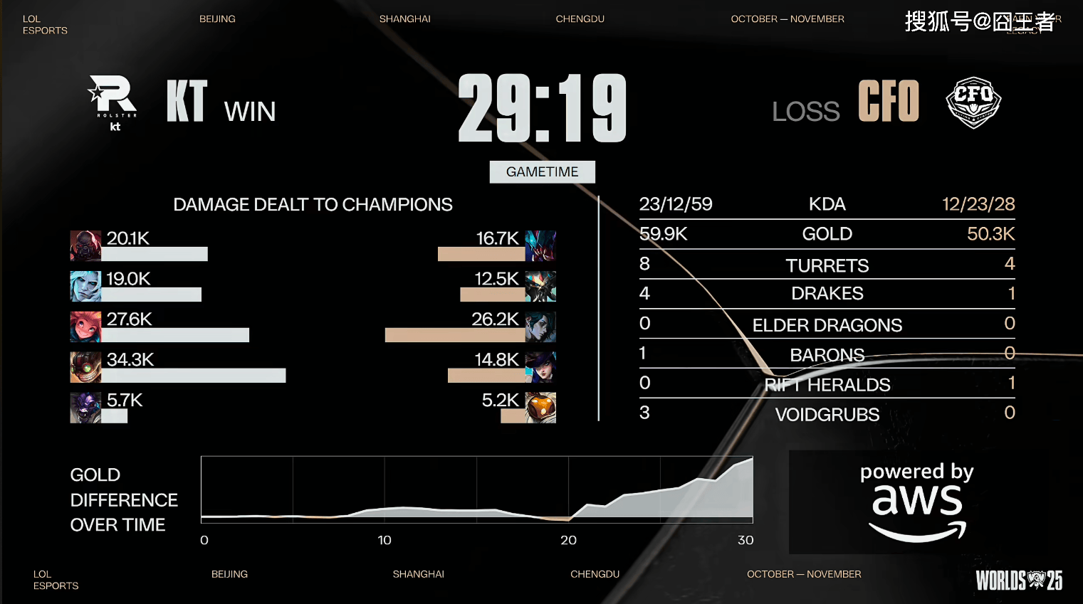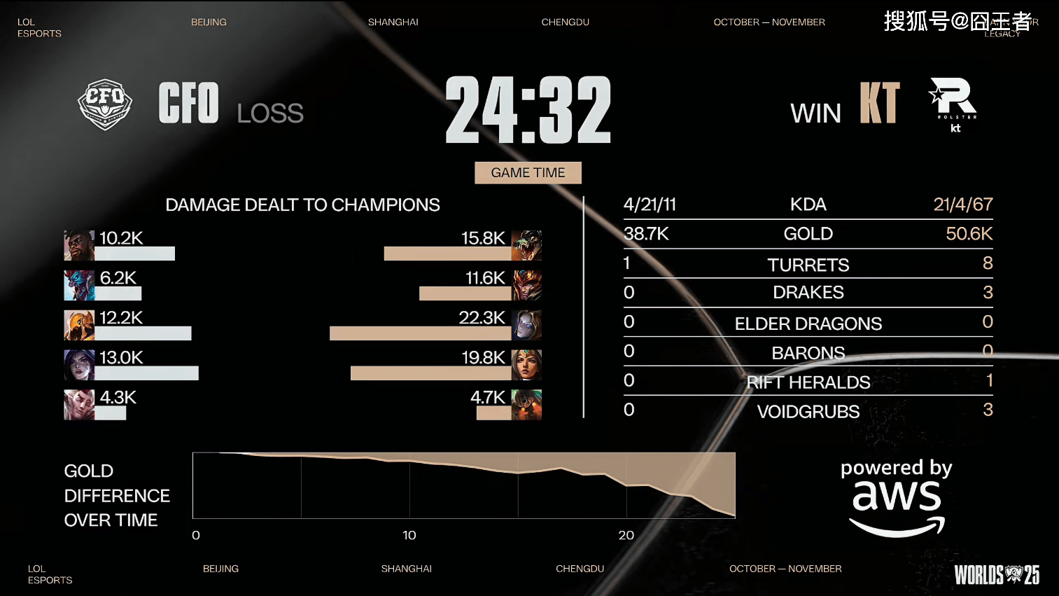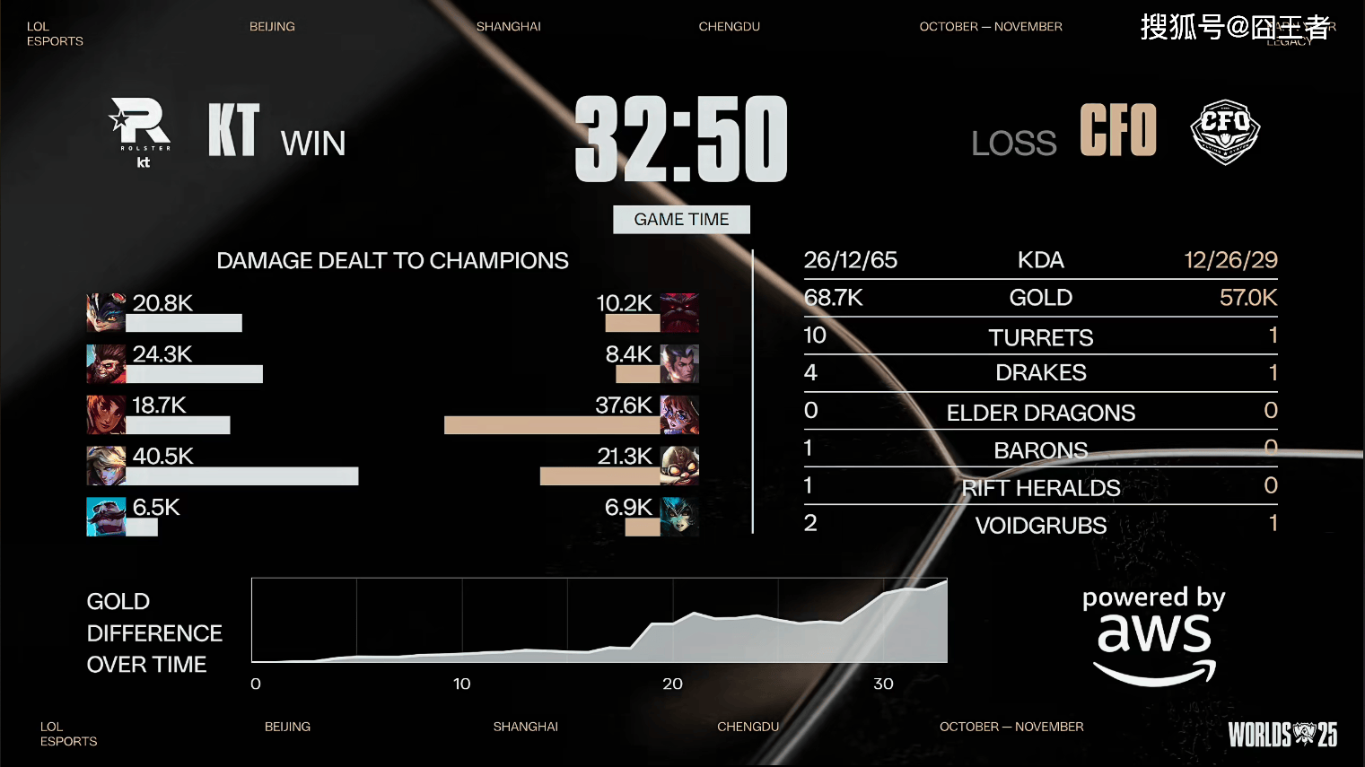 结果第三局比赛,又是被KT打成了的速胜局。比赛第8分钟 左右,中路爆发团战,KT打出1换3;比赛第12分钟左右,野区爆发团战,CFO抓住机会打出0换2;比赛第17分钟左右,爆发小龙团,CFO趁势追击打出0换2;比赛第20分钟左右,Bdd佐伊完美开团,KT打出3换5;最终比赛第28分钟,爆发龙魂团,KT打出1换4;最终29分19秒,KT零封CFO,首次挺进四强。