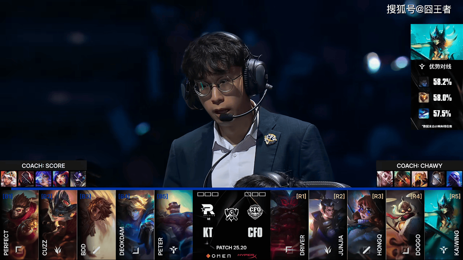 第一局比赛,KT蓝色方,禁用:奇亚娜、赛恩、芸阿娜、妮蔻、阿利斯塔,选用:Perfect兰博、Cuzz猴子、Bdd岩雀、deokdamEZ、Peter布隆;CFO红色方,禁用:沙皇、发条、瑞兹、泰坦、洛,选用:Driver赛恩、JunJia赵信、HongQ阿萝拉、Doggo飞机、Kaiwing娜美