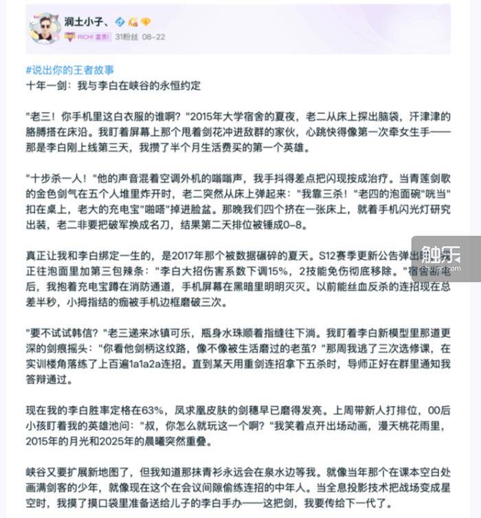 我是通过“王者营地”联系上碎玉和润土的——这是一个玩家们用来查看战绩、游戏资讯和发帖的软件,在游戏十周年的这段时间,官方在营地里发起了故事征集活动。和碎玉、润土的表达类似,大部分人对《王者荣耀》的记忆很难用时间节点划分,而是由断续的碎片构成的,某个皮肤、强势英雄、主播、职业选手或者流行梗……这让我想到玩家和官方都很喜欢的一个游戏里的词,“高光时刻”,无数玩家的高光时刻一起,组成了一款游戏的十年时光。