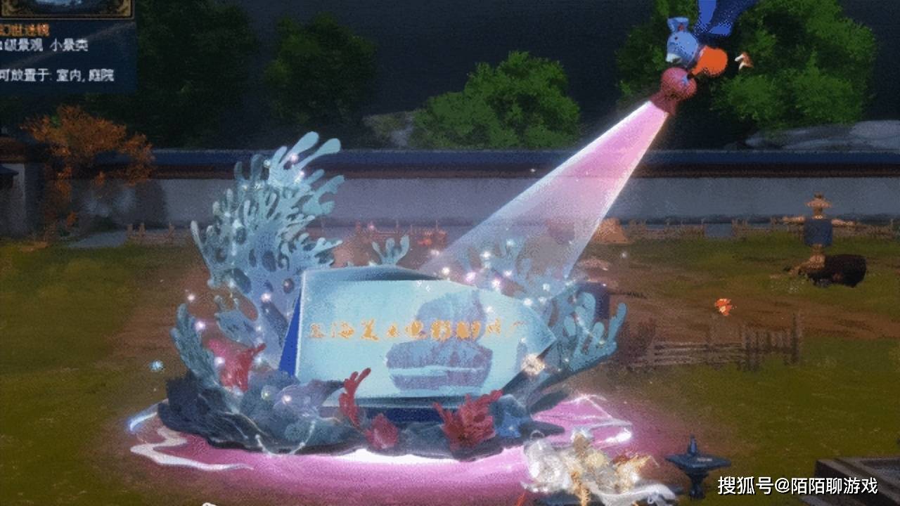 踏入家园,最令人惊喜的莫过于那台独具匠心的联动家具——“幻世迷镜”。它绝非寻常物件,晶莹剔透的“屏幕”由珍稀的冰透石镜打造,仿佛凝结了时光的露珠,更妙的是,整块镜面被灵动婉转的蓝色珊瑚环抱,珊瑚枝桠间荧光点点,如梦似幻,仅是静置于家园,便已是一件艺术珍品。