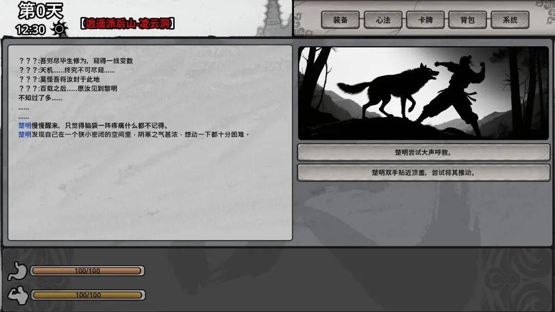 这是一款 MUD+轻度卡牌构筑的末世武侠题材游戏。玩家在其中将面临战斗后造成的伤势,在生存压力下的抉择。游戏剧情分支多且有不同结局。希望玩家能自行探索!