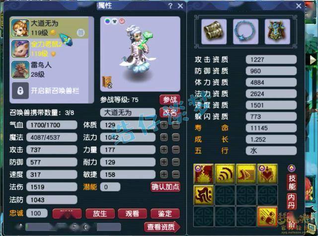 100级简易混沌兽套铠甲,魔力双加39,打了10锻舍利子。
