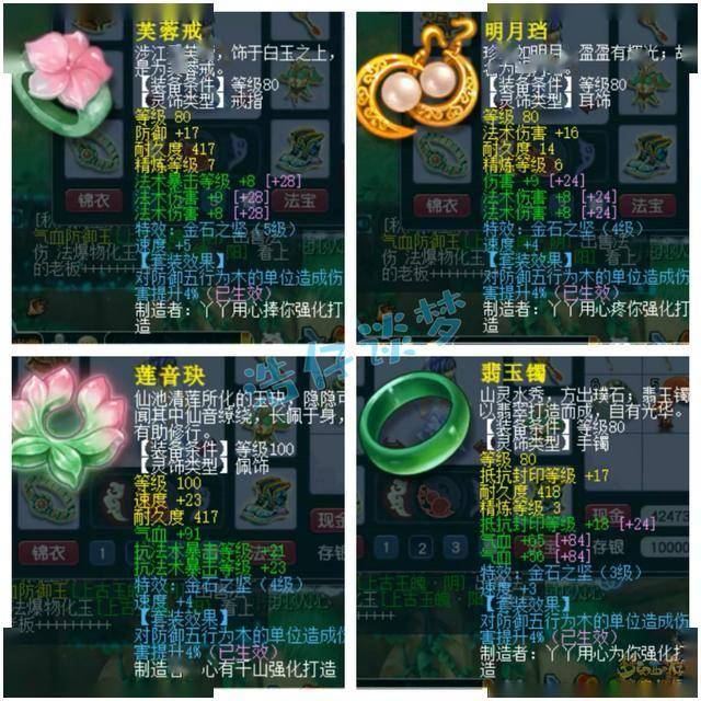 戒指下排双法伤一法暴,耳饰下排双法伤一伤害,配饰下排气血双抗法暴,手镯下排双气血一抗封,特效选择了金石之坚。