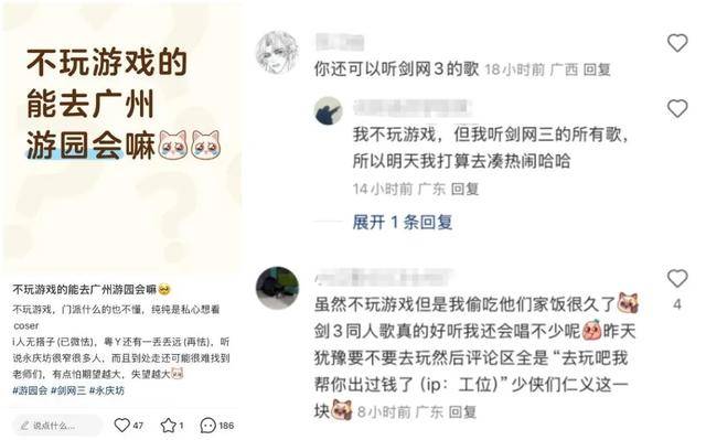 在微博和小红书等社交平台,也冒出了大量与《剑网3》永庆坊活动相关的帖子,包括找饭搭子、分享自己准备的无料、交流气温穿着、约上台参加唱歌活动的伙伴等等。甚至这个阶段活动已然“出圈”,有不玩《剑网3》却对活动很感兴趣的网友询问大家能不能参加、要注意哪些事项,吸引了许多玩家支持以及提供小建议。