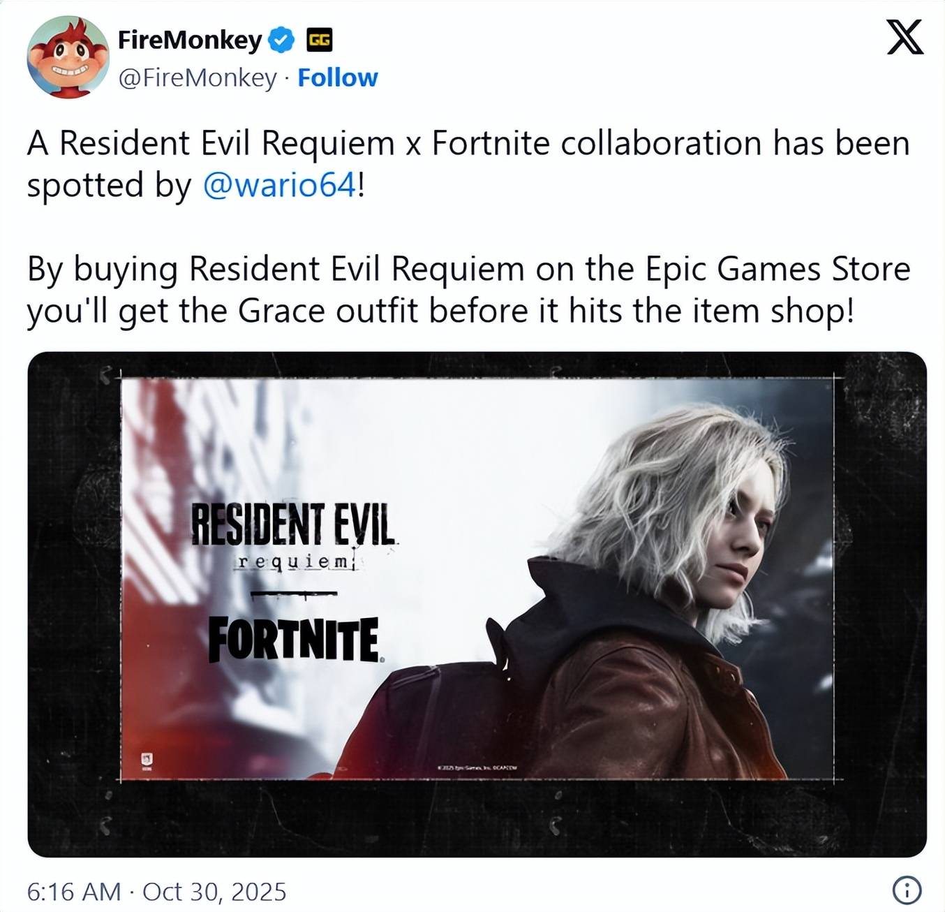 《堡垒之夜》此前曾与《生化危机》系列有过合作,出过克里斯、吉尔皮肤,后来里昂和克莱尔也加入大逃杀模式。