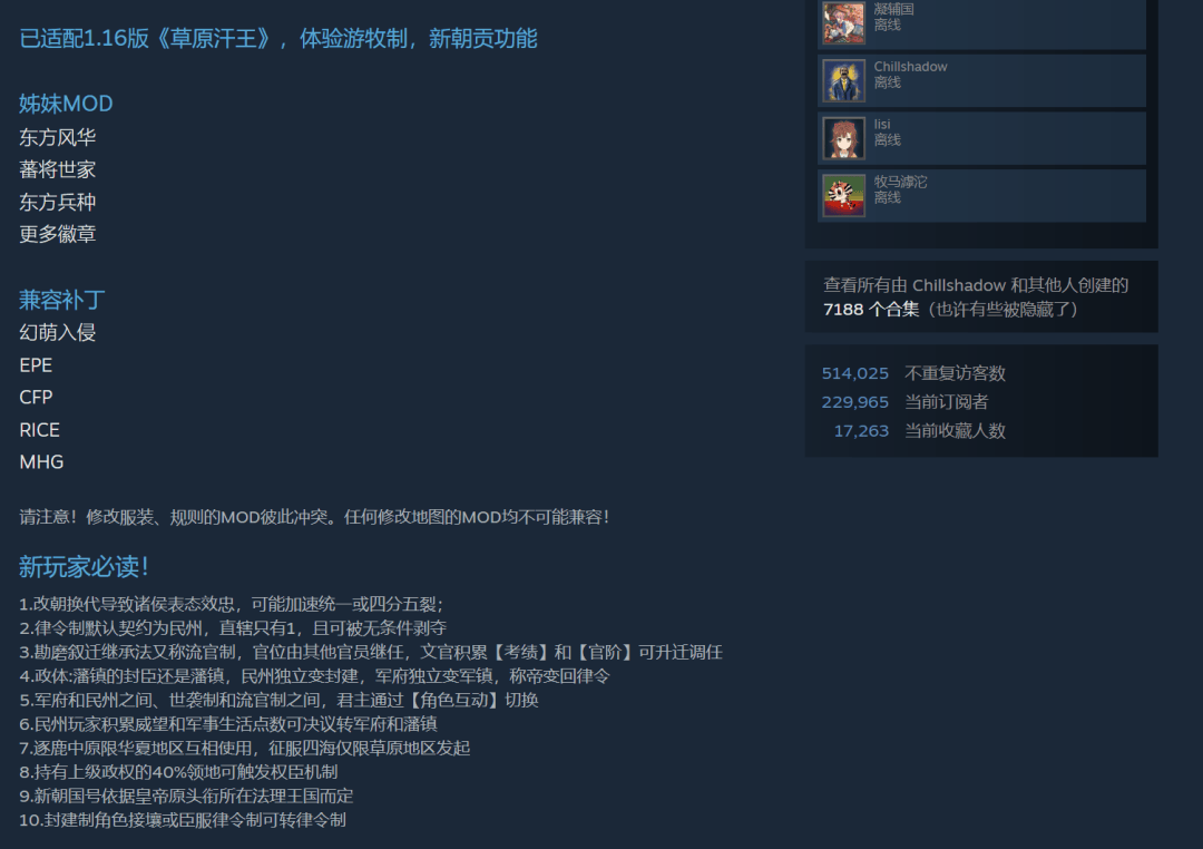 通过这一系列新增机制和改动,在DLC中玩家已经能够较为完整的体验到古代中国的政治生态。这并不完美,甚至可以说还有很多需要调整和改进的地方,但游戏已经从底层打好了基础,未来还是相当值得期待的,这不还有强大的玩家社区嘛。