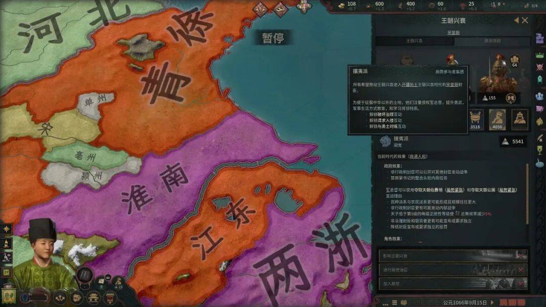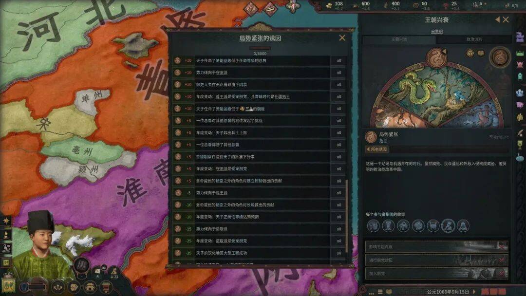 例如在“政通人和”的局势下,皇帝无法亲自发动对外战争,只能通过大型工程中的“开边”决议来给手下的封臣制定战略目标。这也就意味着玩家在这个阶段需要将主要的精力放在国家的内政上,在这个局势下玩家拥有许多内政治理相关的BUFF,用来模拟“治世”,对于喜爱种田的玩家来说可以好好过一把建设瘾。