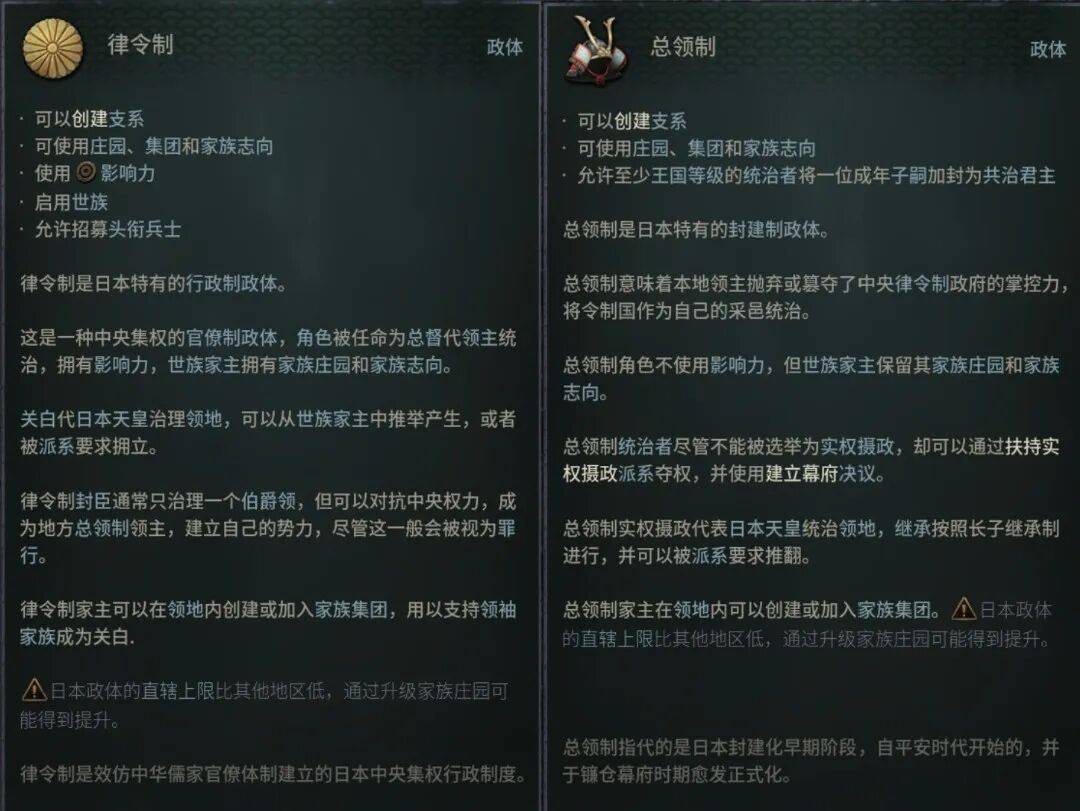 而日本则非常奢侈的拥有“律令制”和“总领制”两种政体,用来模拟平安京朝廷与地方豪族武士的差异,并且在这一时代天皇已经被关白代表的权臣家族架空,所以收回权力的天皇、统一日本的关白、建立幕府的武士都是值得一试的选择。