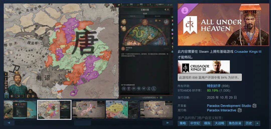 好在,P社铺垫了已久的东方题材DLC「溥天之下」终于来了。10月29日凌晨1点正式解锁发售后仅仅一天,这个DLC已经有了超过一千条评价,目前也跻身CK3历史好评率最高的DLC之一。