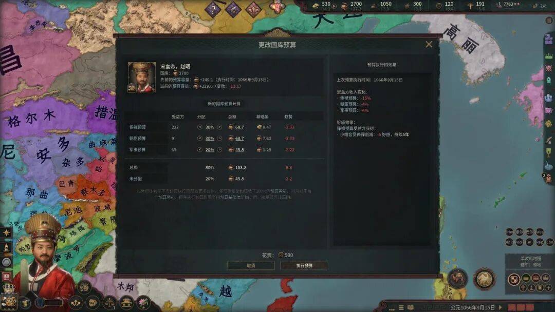 所以「溥天之下」通过“国库”这个系统将领地的财政收入与领主的个人收入区分开来,土地财政收入的一部分上缴中央,一部分留在地方府库中,领主的个人财富来自庄园的产出与朝廷的俸禄。所有的官方行动使用的都是国库中的货币,皇帝每年都需要制订国库的预算分配比例,这往往也代表着朝廷的施政方向。