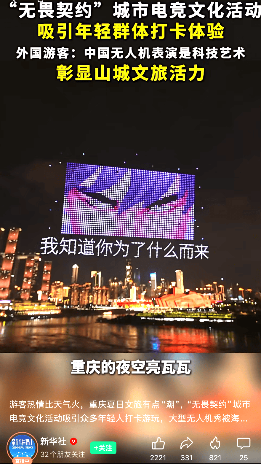 不久前,英雄壹决的无人机阵列点亮了重庆夜空。这位重庆男孩一登场,下面无论是玩家还是路过的市民,手机唰地一下全都举了起来,都在拍这个“重庆崽儿”照亮家乡的瞬间。