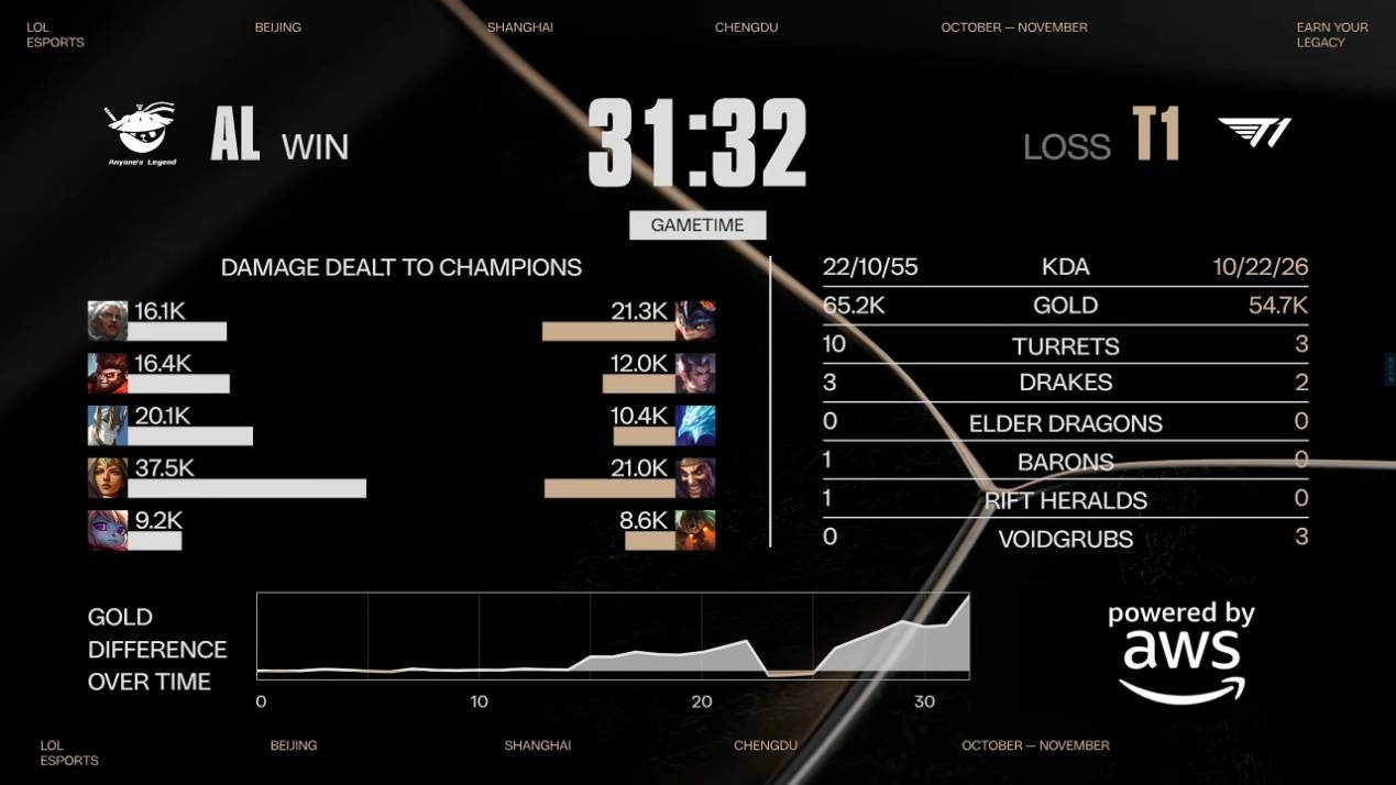20分钟T1选择抱团打厄塔汗,AL快速赶到,Tarzan提前开团进场配合加里奥,T1拿下厄塔汗但被AL打出了一波一换二。22分钟AL出现巨大失误,加里奥没大招猴子野区进场强开,T1冰鸟+兰博控场轻松反打,一波直接打出团灭,将前期劣势全部挽回。