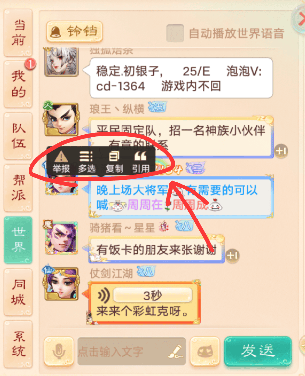 聊天可以长按,进行引用、多选、撤回、举报,还有+1的选项设置,我的里面也收录了战队和好友消息,聊天起来非常方便快捷。