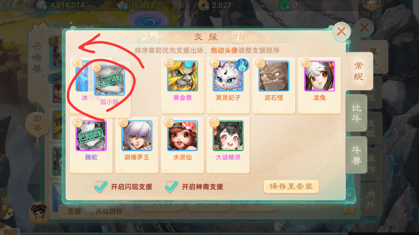 召唤兽支援能拖动头像调整支援顺序,排序靠前优先支援,非常方便操作,调整完成后保存到套装就可以了。