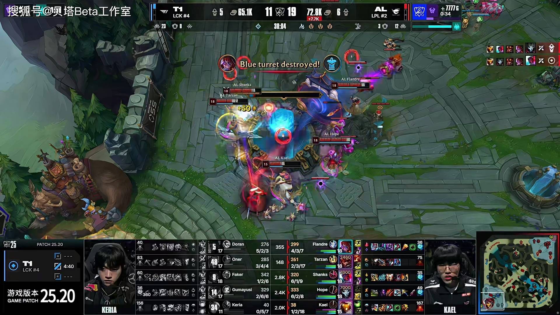 第四局T1上单奥恩,打野梦魇,中单维克托,下路卡莎加妮蔻;AL上单铁男,打野蝎子,中单妖姬,下路飞机加女坦。对线期T1上路主动进攻,打出2换4,AL则是推掉了上路一血塔,前期T1经济领先1K。