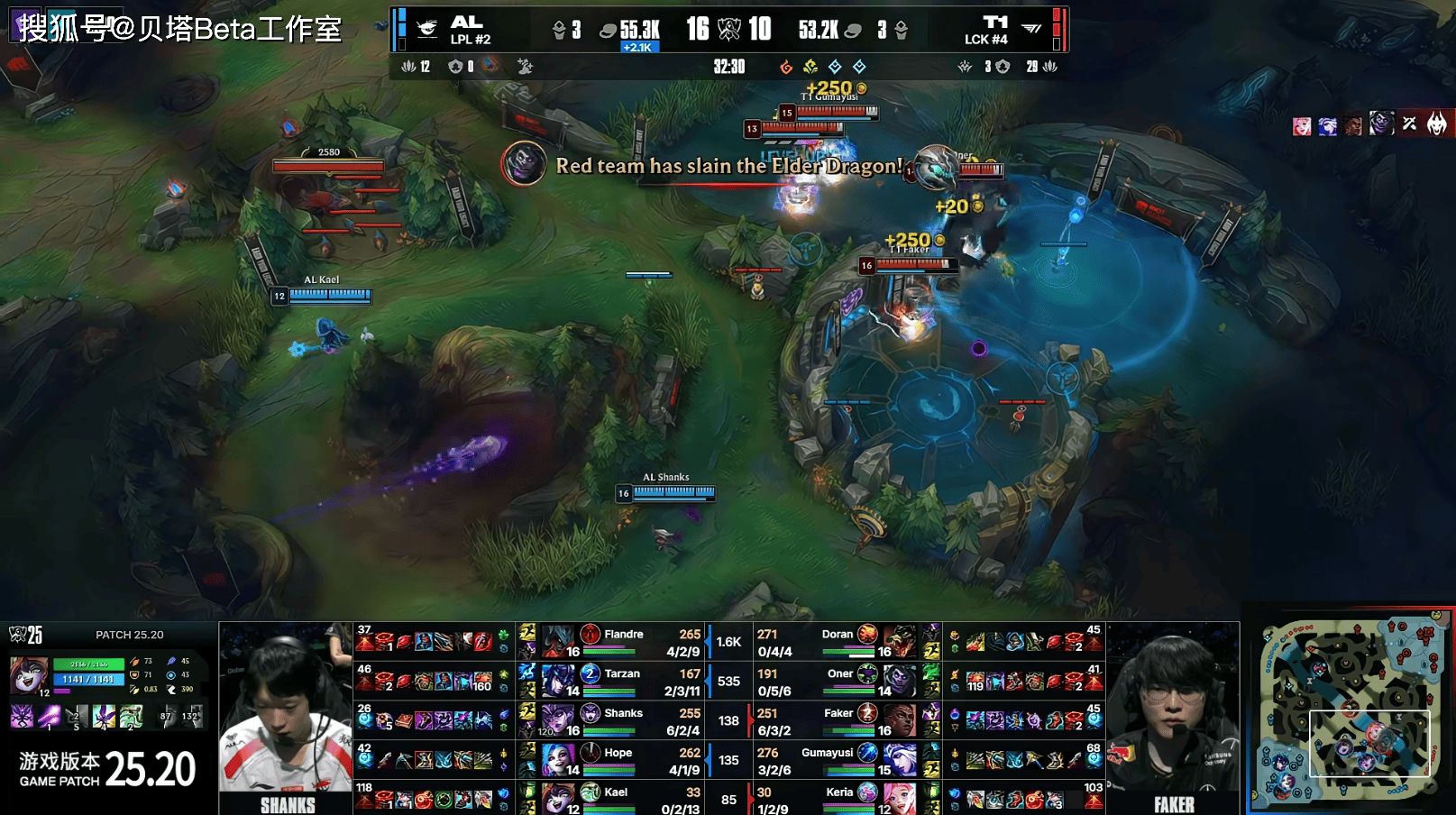 第一局AL上单挖掘机,打野琪亚娜,中单瑞兹,下路EZ加布隆;T1上单赛恩,打野潘森,中单岩雀,下路韦鲁斯加布隆。对线期双方争夺小龙,Doran赛恩开团但是被打残,之后Faker岩雀抬2人,圣枪哥挖掘机进场被秒,T1打出2换4后,拿下小龙,前期双方经济持平。