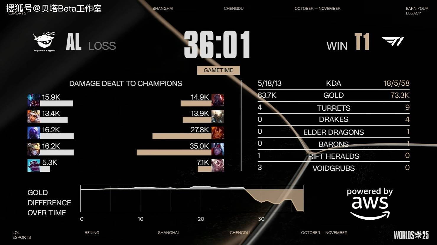 中期23分钟AL在野区抓T1下路双人组,但是所有技能都给Keria机器人,T1其他人支援过来反打击杀AL四人。后期330分钟AL上路抓Faker塞拉斯,虽然Faker拖了很久时间,但是shanks永恩收割,T1打出2换4后,拿下土龙魂。后期35分钟AL主动打大龙,T1赶来阻止,AL直接开团Gumayusi炸弹人被秒,AL打出0换3后,拿下第一条大龙。35分钟双方野区打出1换1,Oner蔚被秒,随后AL拿下远古龙后团灭T1,拿下第三局的胜利。