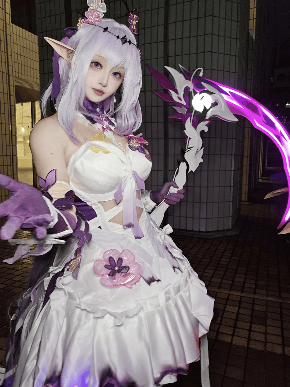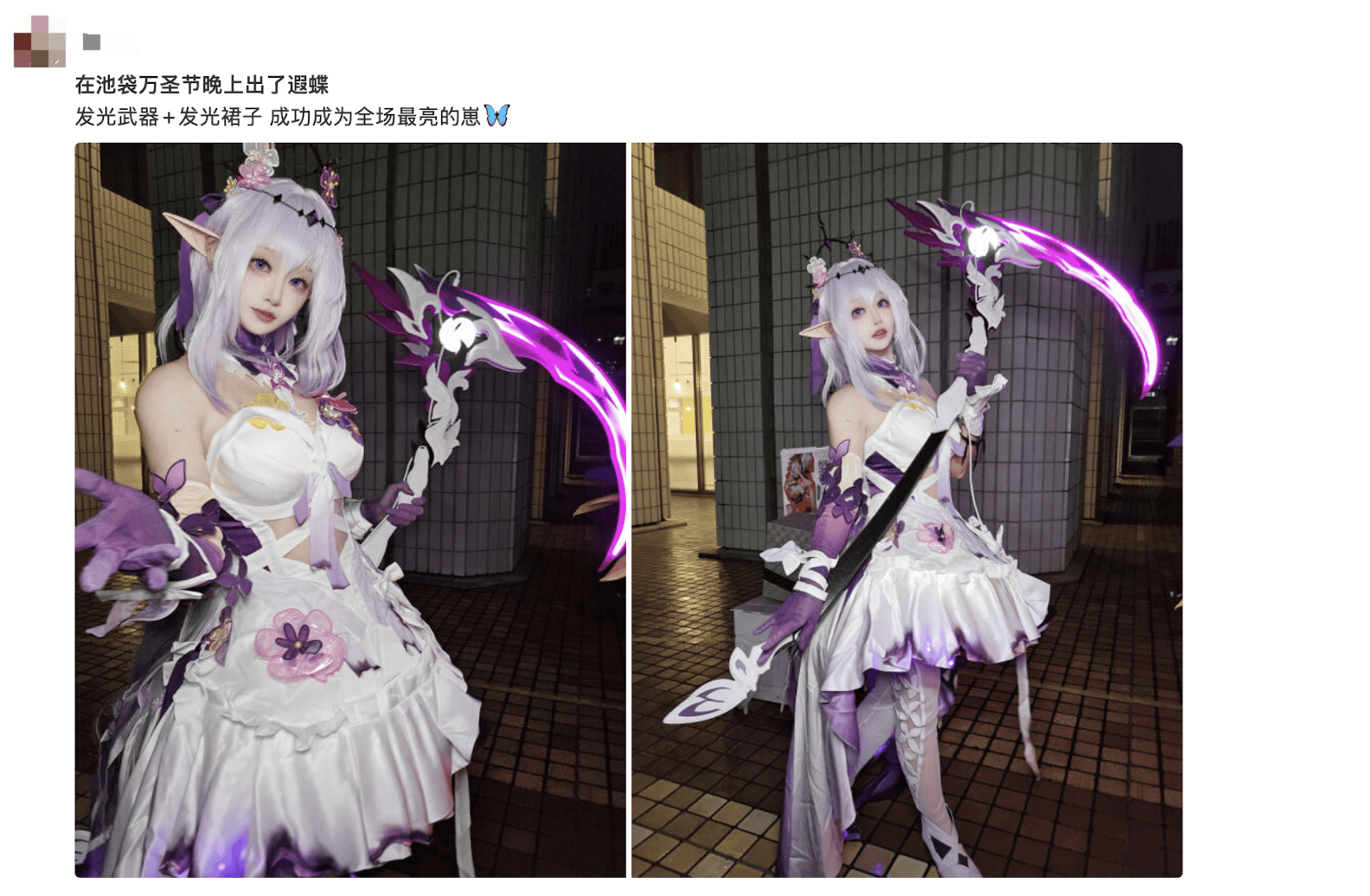 而且这位玩家准备的COS也是根据万圣节的氛围来定制的,镰刀和裙子都装了灯带,发光武器和发光裙子,让遐蝶一下成为了全场最亮的崽,还是物理意义上的,难怪能够被崩铁玩家一眼认出来,确实有点太抢眼了。