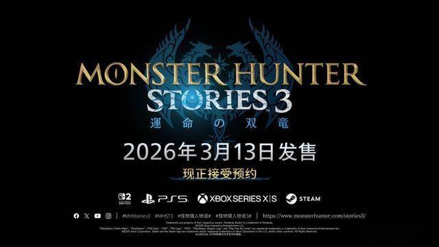 《怪物猎人物语3:命运双龙》将于2026年3月13日登陆Switch 2、PS5、Xbox以及PC平台,游戏现已开启预购。