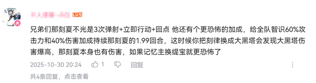 而单次生效的角色也丝毫不逊色于整场生效的角色。例如大佬“Narwalncy”开发的0+0那刻夏、昔涟、刻律德菈以及记忆主阵容,居然做到了全程无伤0T过骑士三,这个强度让无数抽了那刻夏的玩家为之振奋。