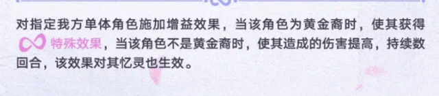 在完成变身后,昔涟可以给场上任意一位队友增加一个BUFF,如果这名队友不是黄金裔,昔涟给到的BUFF为持续一定回合的增伤。如果该角色为黄金裔,那给到的效果会根据角色不同发生变化。