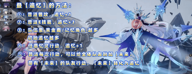 那么,昔涟叠加“追忆”的方式是什么呢?方法一共有5种,分别是普攻(1点)、E技能(3点)、任意忆灵行动(1点)、拥有“未来”BUFF队友行动时(1点)以及队内黄金裔、记忆角色越多,进战的昔涟初始“追忆”可获得2/3/6点追忆。