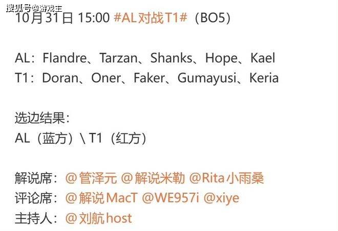 接下来的这场比赛应该是所有玩家都非常关注的,al战队和T1战队的三年之约,首先看一下双方战队的首发选手,上单圣枪哥,打野tarzan,中单香克斯,AD hope,辅助kael。T1战队上单doran,打野oner,中单faker,AD小吕布,辅助keria。双方并没有任何的人员变动,T1战队的BO 5大家都知道,强的离谱,尤其是他们的中单faker,但我们的中单选手香克斯在这个世界赛的舞台中发挥的也非常出色,在和hle以及gen战队交手结束之后,他应该充电完毕了。